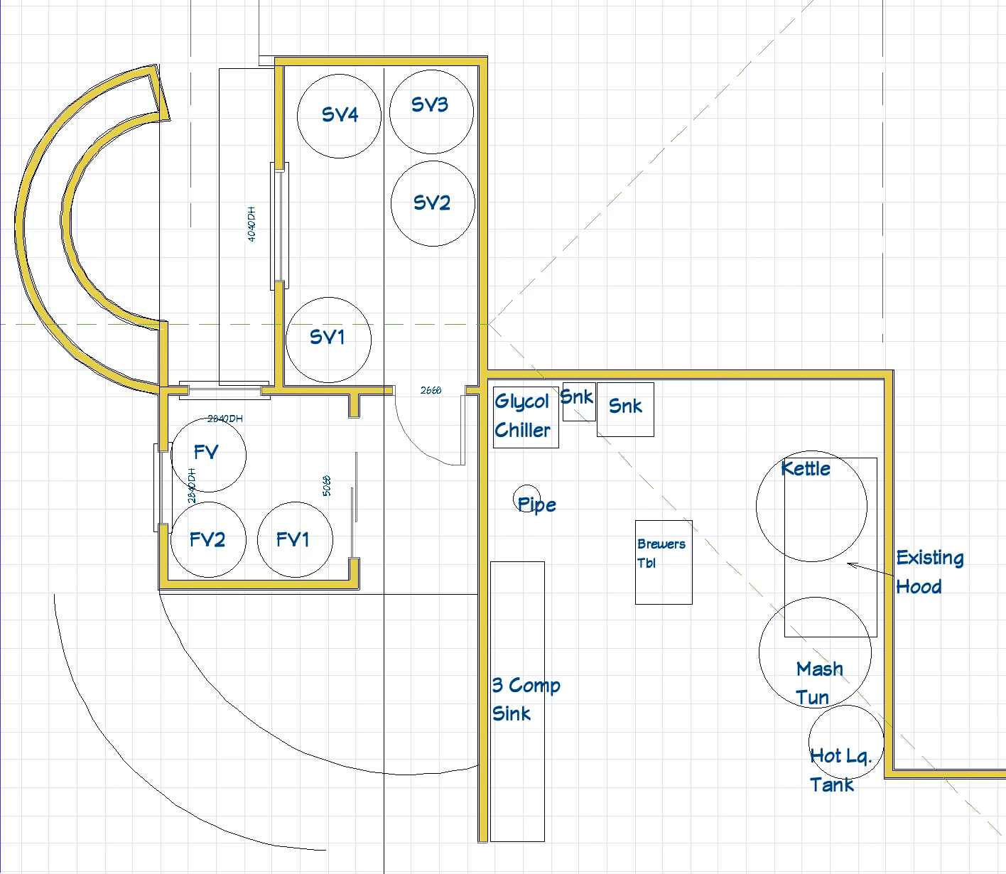 The only way I could make this work is to place the cooler right under the balcony with room for 4 serving tanks and some kegs. A small room that could hold 3 Letina 1000L fermentation vessels would be just beyond where the balcony would be. I would run 2 tri clamp pipes from the kitchen close to the ceiling to the fermentation room. You use two so you can create a loop for cleaning and sanitizing them. On brew day, you would run your transfer hose from the heat exchanger in the kitchen to the tri clamp pipe and then from the tri clamp pipe in the fermentation room into the fermenter. Not ideal, but workable.